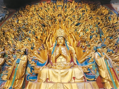 决定了大足石刻“海拔”的,自然当属“五山”中的宝顶山,位于大足城区东北15公里宝顶镇。宝顶山摩崖造像是1961年国务院公布的第一批全国重点文物保护单位。宝顶山石刻中,又以大佛湾造像为主体,其形如“U”形,全长约500米,造像镌刻于东、南、北三面崖壁上,自护法神像至柳本尊正觉像,19幅大型组雕比邻相连、无一雷同、传神灵动、蔚为壮观。世所熟知的千手观音造像,也在此间——如果说,宝顶山象征大足石刻的桂冠,那么千手观音就是桂冠上最夺目的明珠。
